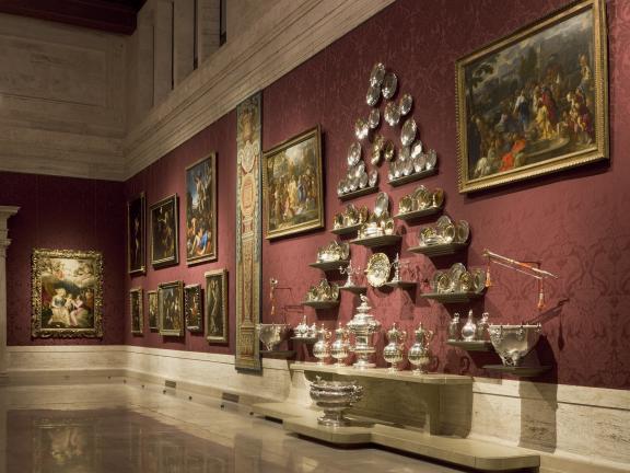One of the most dramatic spaces in the Museum, the Koch Gallery re-opened in September 2012. View a time-lapse video of the three-month-long transformation. Now, tapestries splendidly complement an array of Old Master paintings against a background of rich damask. A handsome pair of silver Baroque trumpets used in royal ceremonies for the German House of Hanover join the Museum's celebrated collection of Hanoverian silver—hear them play! Come visit this vast and sumptuous grand room fit for royalty.