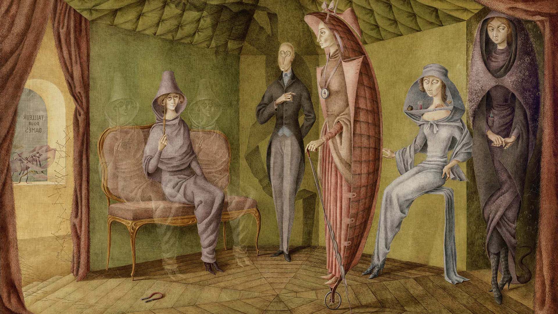 Remedios Varo, Tailleur pour dames (detail), 1957. Oil on board. Museum purchase with funds by exchange from the Alfred Stieglitz Collection—Bequest of Georgia O’Keeffe, and a Gift of the Stephen and Sybil Stone Foundation. © 2025 Remedios Varo, Artists Rights Society (ARS), New York / VEGAP, Madrid.